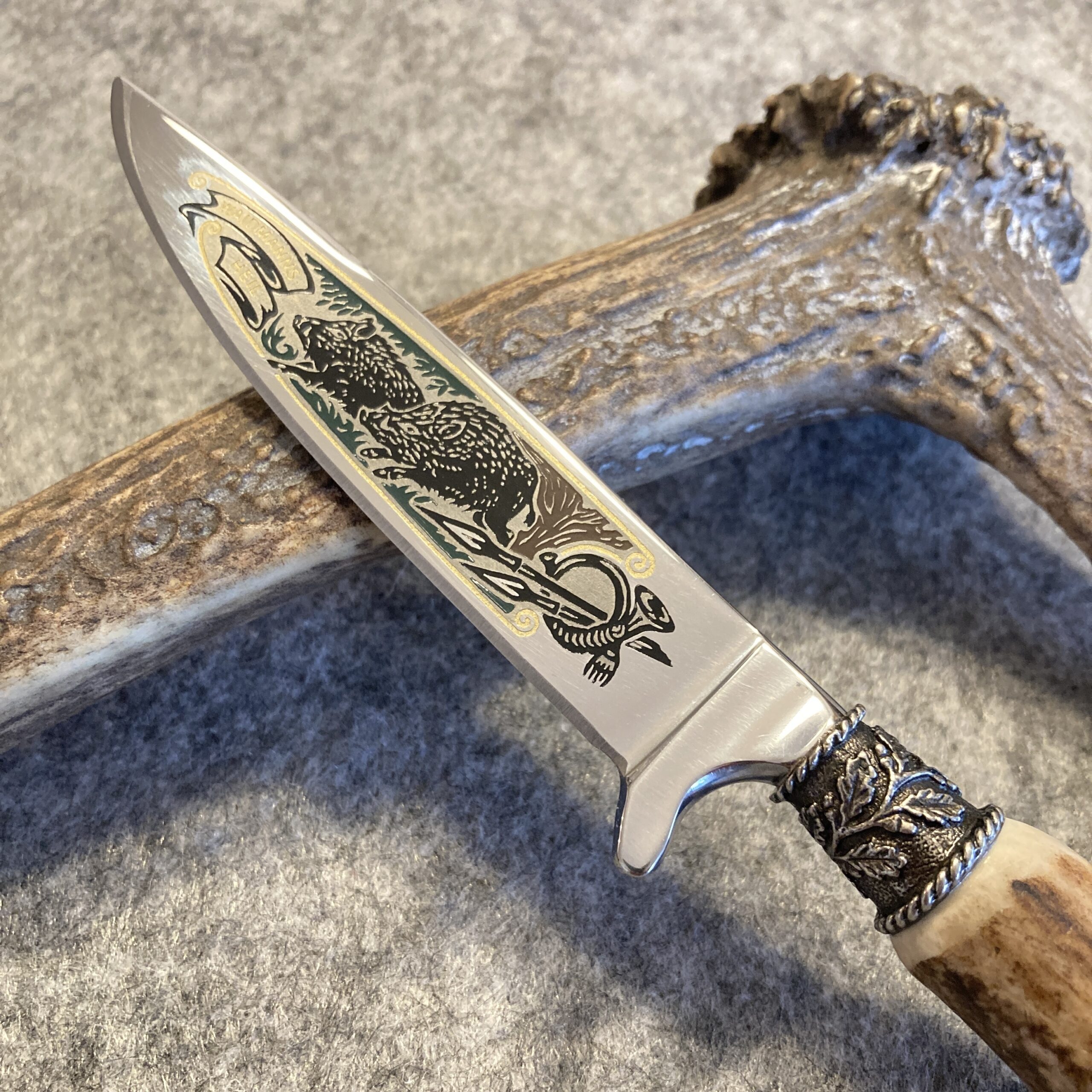 Der Jagdnicker verfügt über eine hochwertige Klinge aus 1.4116-Stahl und zeigt ein wunderschönes Motiv von Wildschweinen und der Aufschrift „Waidmanns Heil“.